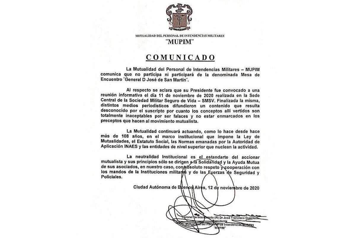 La Mutual del Personal de Intendencias Militares sumó su rechazo a la "mesa de enlace" militar