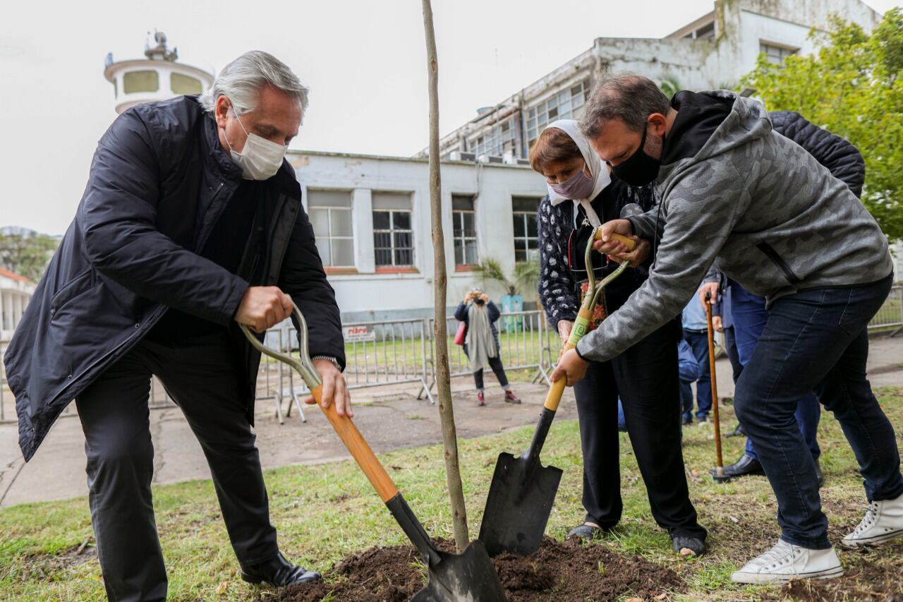 Cuando bajó de su auto, a Alberto Fernández lo esperaban en la entrada de la casa de HIJOS en la ex ESMA con un jacarandá y una pala con la que iba a tener que plantar el árbol como parte de