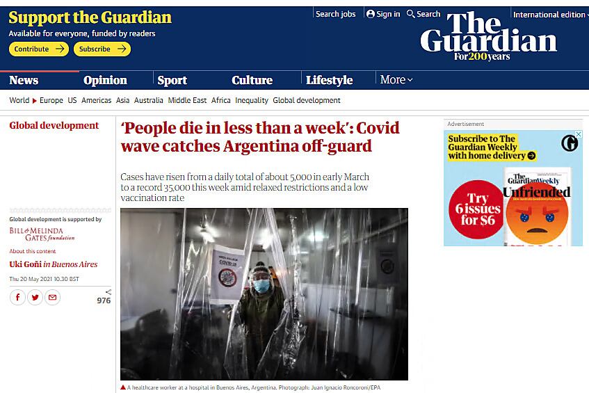 El diario británico señaló la actitud de la oposición de no acompañar las medidas de cuidado dispuestas por el Gobierno nacional en el peor momento de la segunda ola. Específicamente se refirió a la decisión del macrismo de judicializar la cuestión en la Corte Suprema.