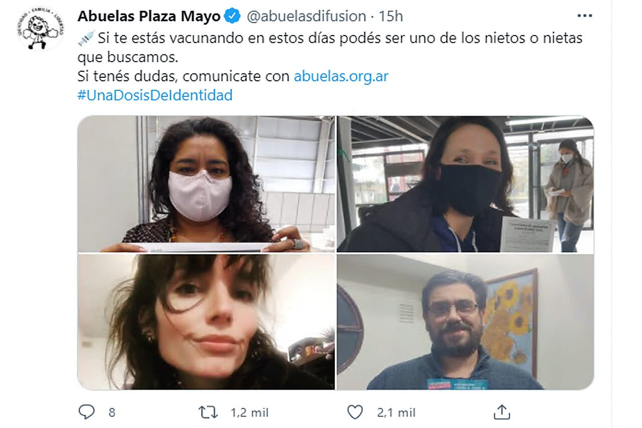 Abuelas de Plaza de Mayo lanzó la campaña "Una Dosis De Identidad" que convoca a postear en redes sociales fotos de personas que se hayan vacunado contra el coronavirus -en el rango e