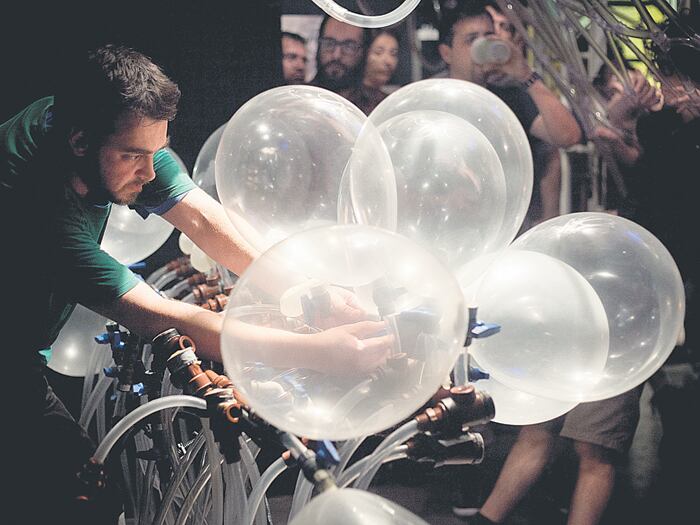 Javier Bustos explora las sonoridades del látex con un insólito y flashero instrumento eólico.