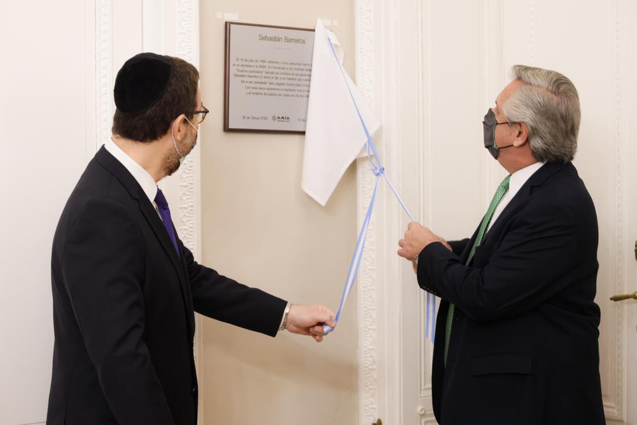 Una placa que recuerda a Sebastián Barreiros, la víctima más joven del atentado a la Asociación Mutual Israelita Argentina (AMIA) hace casi 27 años, fue descubierta en la antesala del despacho pres