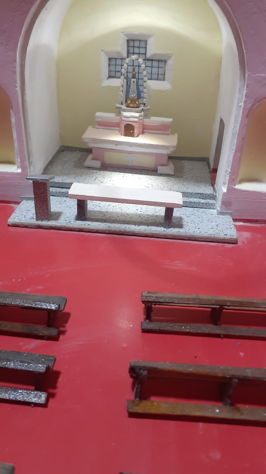 Aún resta que coloque “personas” en la maqueta, donde el principal será el sacerdote, ya que la maqueta cuenta con un sistema de parlantes para grabar y reproducir las misas. “No sé cuántas horas le dediqué, recuerdo que fueron meses completos”, agregó el hombre.