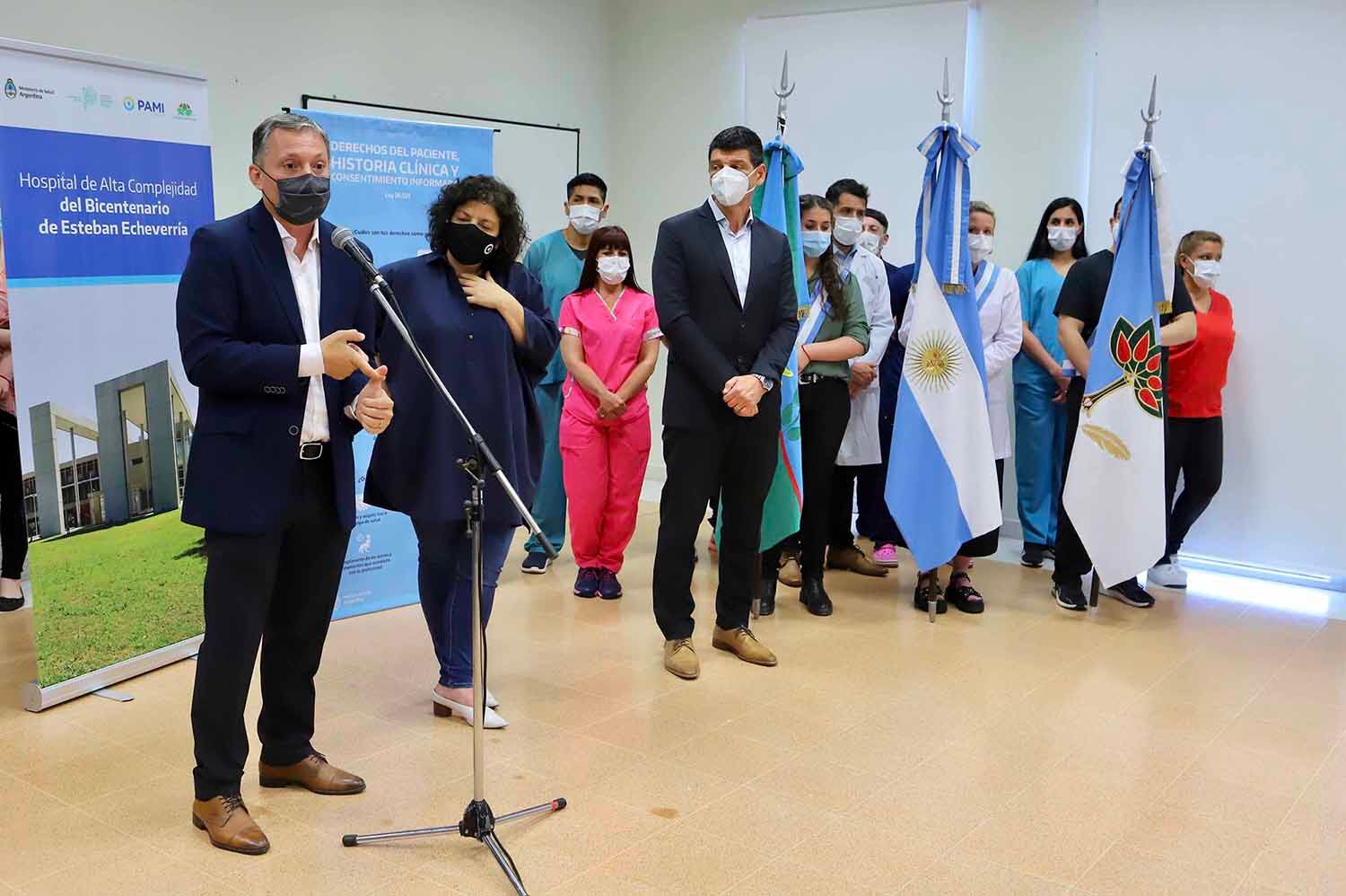 El intendente de Esteban Echeverría, Fernando Gray, junto a la ministra de Salud de la Nación, Carla Vizzotti, y al secretario de Calidad en Salud del Ministerio, Arnaldo Medina
