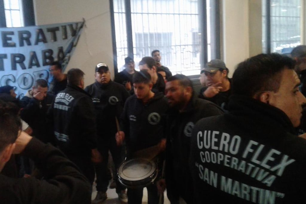 Trabajadores de la fábrica recuperada Cueroflex, de San Martín, protestan en el Ministerio porque recibieron facturas millonarias de luz y gas que ponen en riesgo 80 puestos de trabajo. Piden que el ministro Aranguren los reciba.