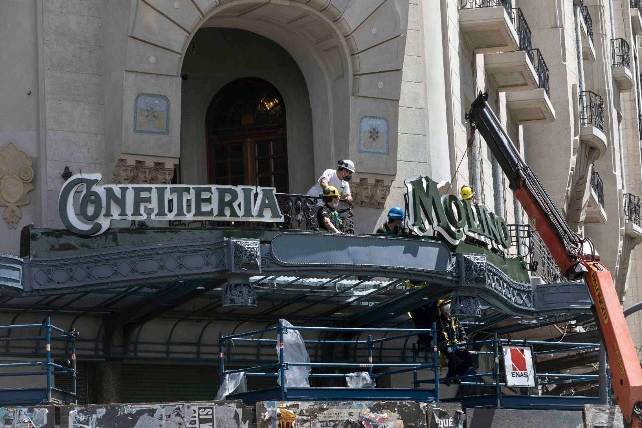El emblemático cartel de la Confitería del Molino, en la esquina de Callao y Rivadavia, volvió a colocarse iluminado y completamente restaurado.
