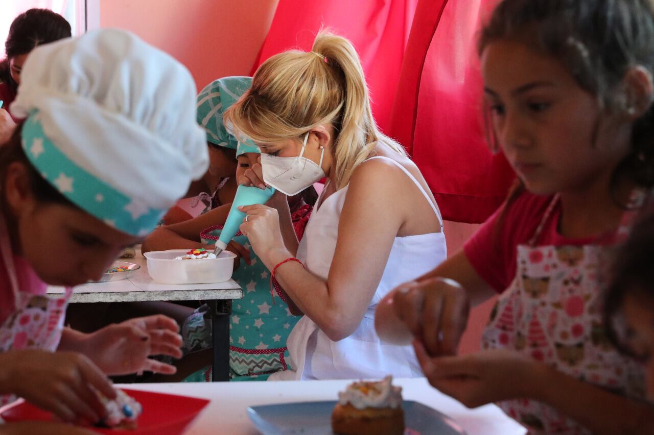 Fabiola Yáñez volvió a visitar el comedor Esperanza Kilme y participó de un taller de cocina con chicas y chicos