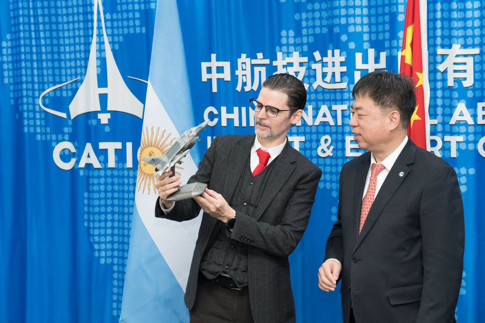 El embajador argentino en China, Sabino Vaca Narvaja, fue recibido por el vicepresidente de la China National Aero-Technology Import & Export Corporation (Catic), Wang Yaoxin, como parte de "un