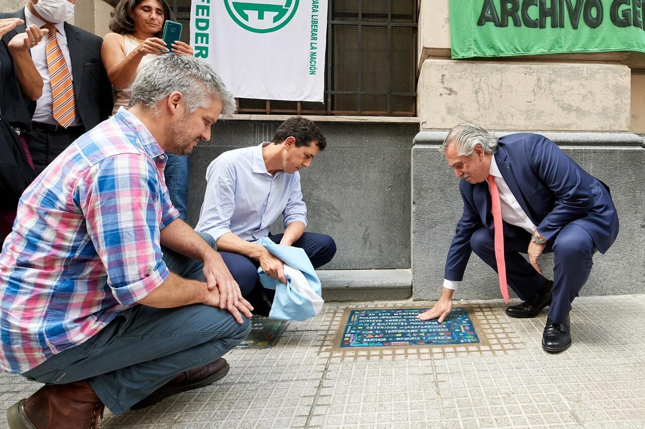 El presidente Alberto Fernández y el ministro del Interior, Eduardo "Wado" de Pedro, descubrieron una baldosa en la entrada de esa cartera, en el barrio porteño de San Nicolás, en memoria de Gu