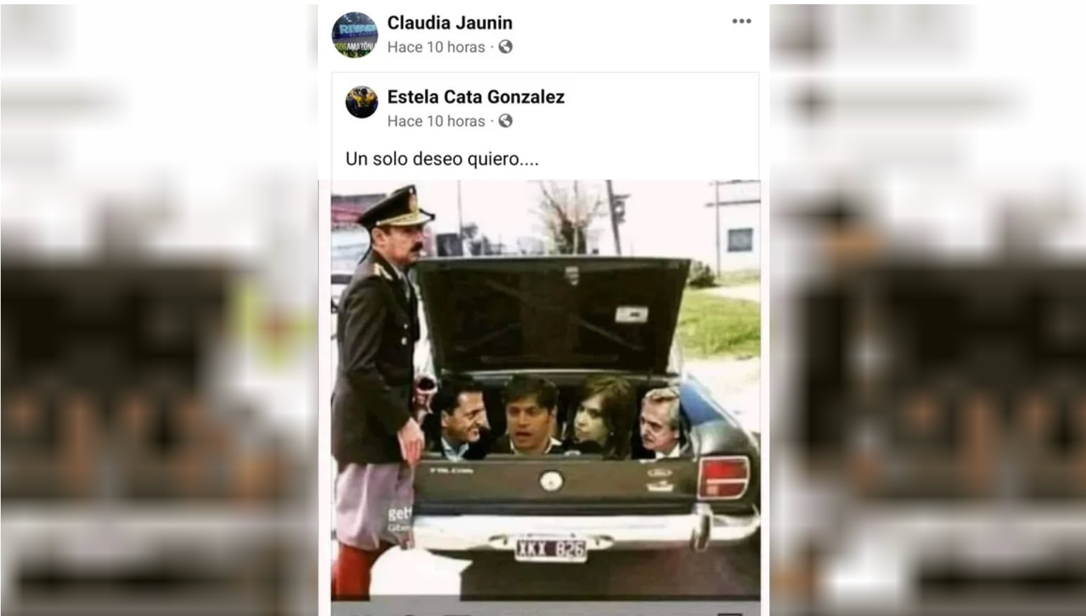 Claudia Jaunin, subdirectora del área de Turismo de Rivadavia, compartió una imagen en facebook donde aparecen figuras del gobierno nacional en el baúl de un Falcón verde junto al dictador Videla. Tras las críticas, eliminó la publicación.