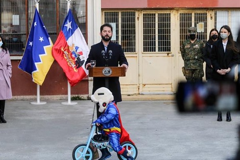 Ninguno de los presentes detuvo al pequeño superhéroe, que llegó a dar nueve vueltas a toda velocidad rodeando a Boric, que hablaba de la importancia de que los chilenos se sientan “profundamente orgullosos” de lo que estaban viviendo. “En los momentos difíciles que pasamos como país tomamos como opción para resolver nuestras diferencias más democracia, nunca menos. Eso nos tiene que hacer rebosar de orgullo patrio y nacional", decía el presidente.