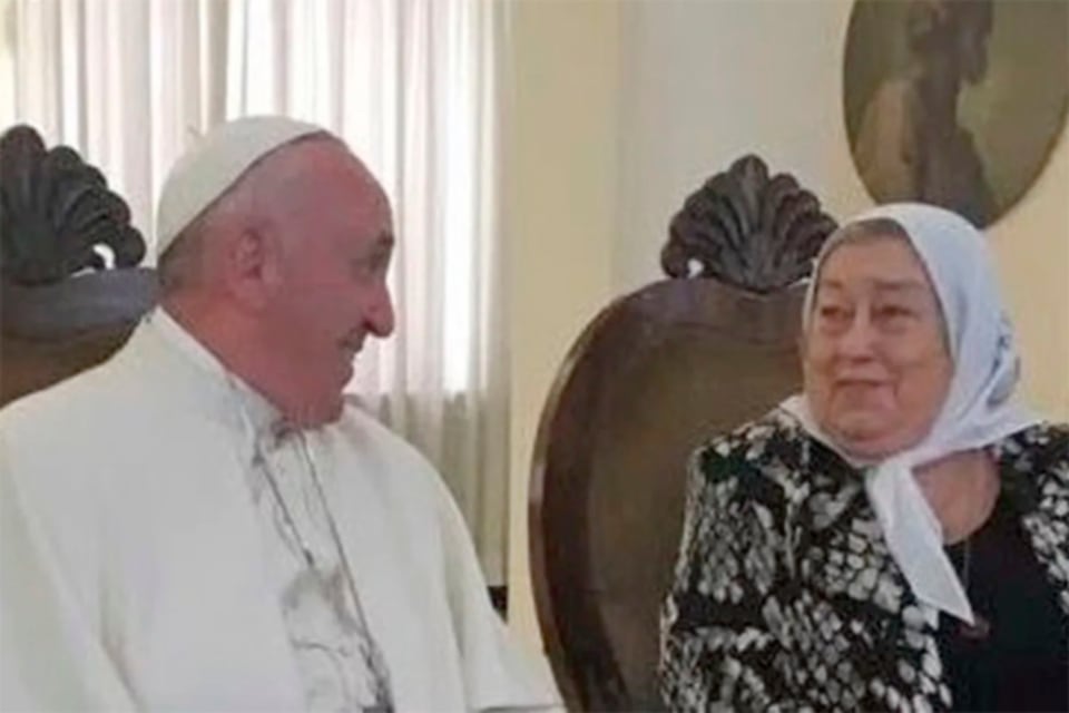 En una misiva a la Asociación Madres de Plaza de Mayo, cuyo contenido se conoció hoy, Francisco dijo que reza por el "descanso eterno" de Bonafini y resaltó que "en momentos donde imperaba el silencio, impulsó y después mantuvo viva la búsqueda por la verdad, la memoria y la justicia". El encuentro entre ambos en el Vaticano.