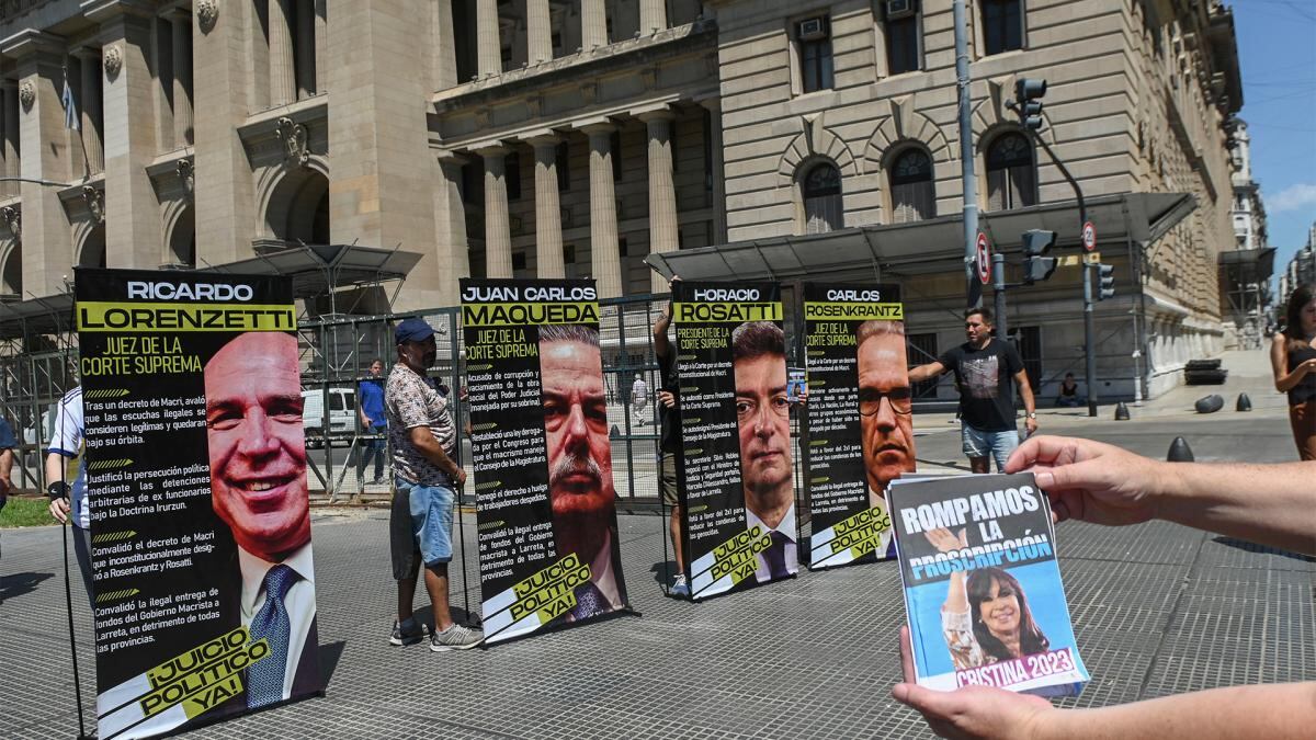Realizaron una actividad frente al Palacio de Justicia para denunciar la proscripción a Cristina Fernández de Kirchner y para explicar los motivos por los cuales exigen que se procese a los cuatro jueces del Máximo Tribunal.