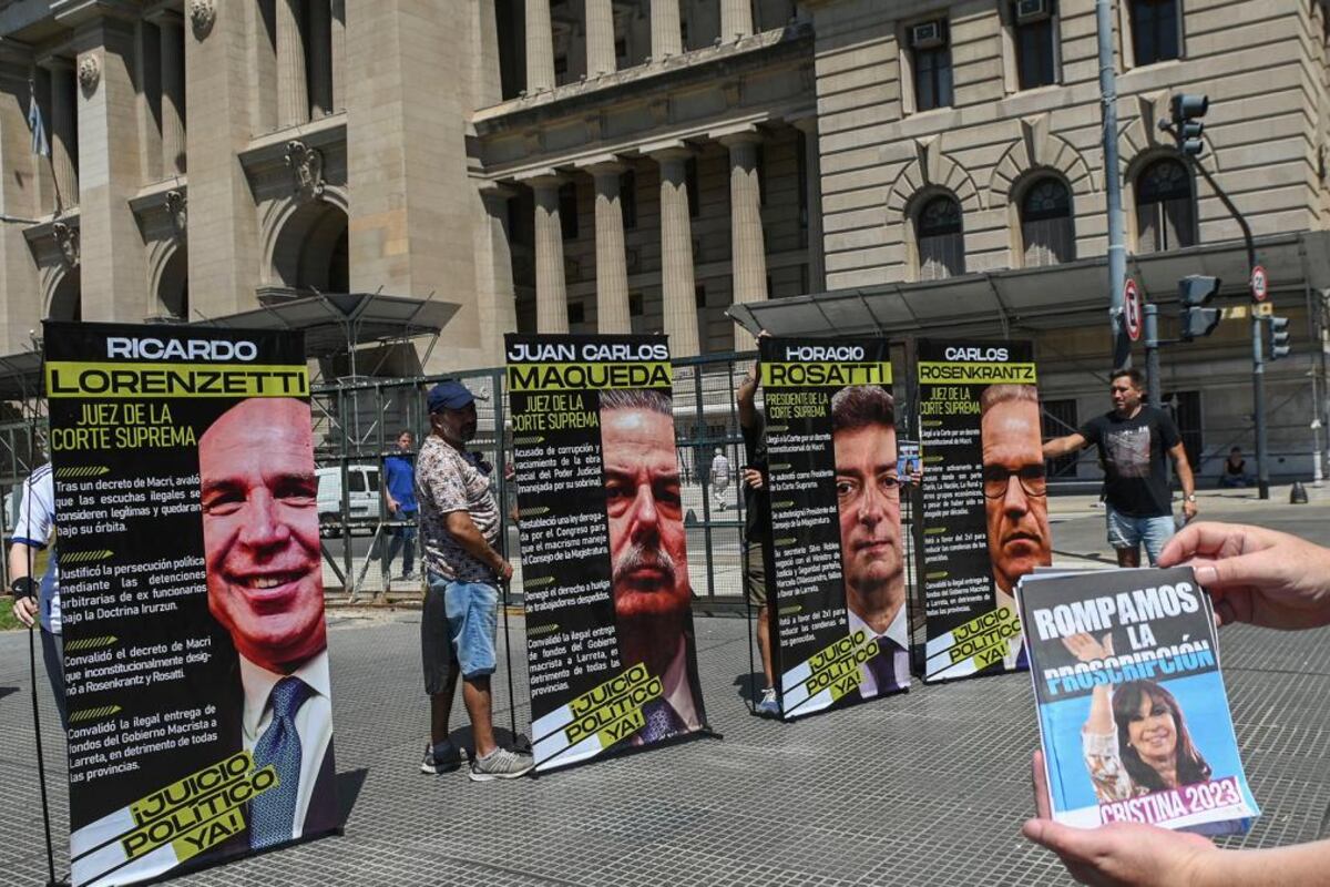 Realizaron una actividad frente al Palacio de Justicia para denunciar la proscripción a Cristina Fernández de Kirchner y para explicar los motivos por los cuales exigen que se procese a los cuatro jueces del Máximo Tribunal.