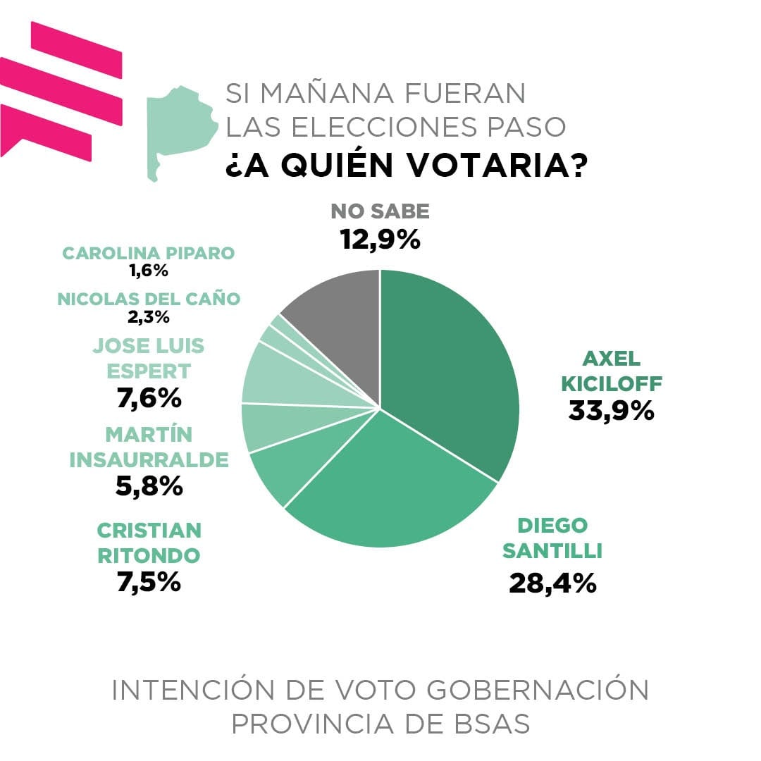 Kicillof encabeza las preferencias con una diferencia más exigua que otros estudios. Larreta gana su interna, pero el oficialismo, medido por marca, vence a JxC.