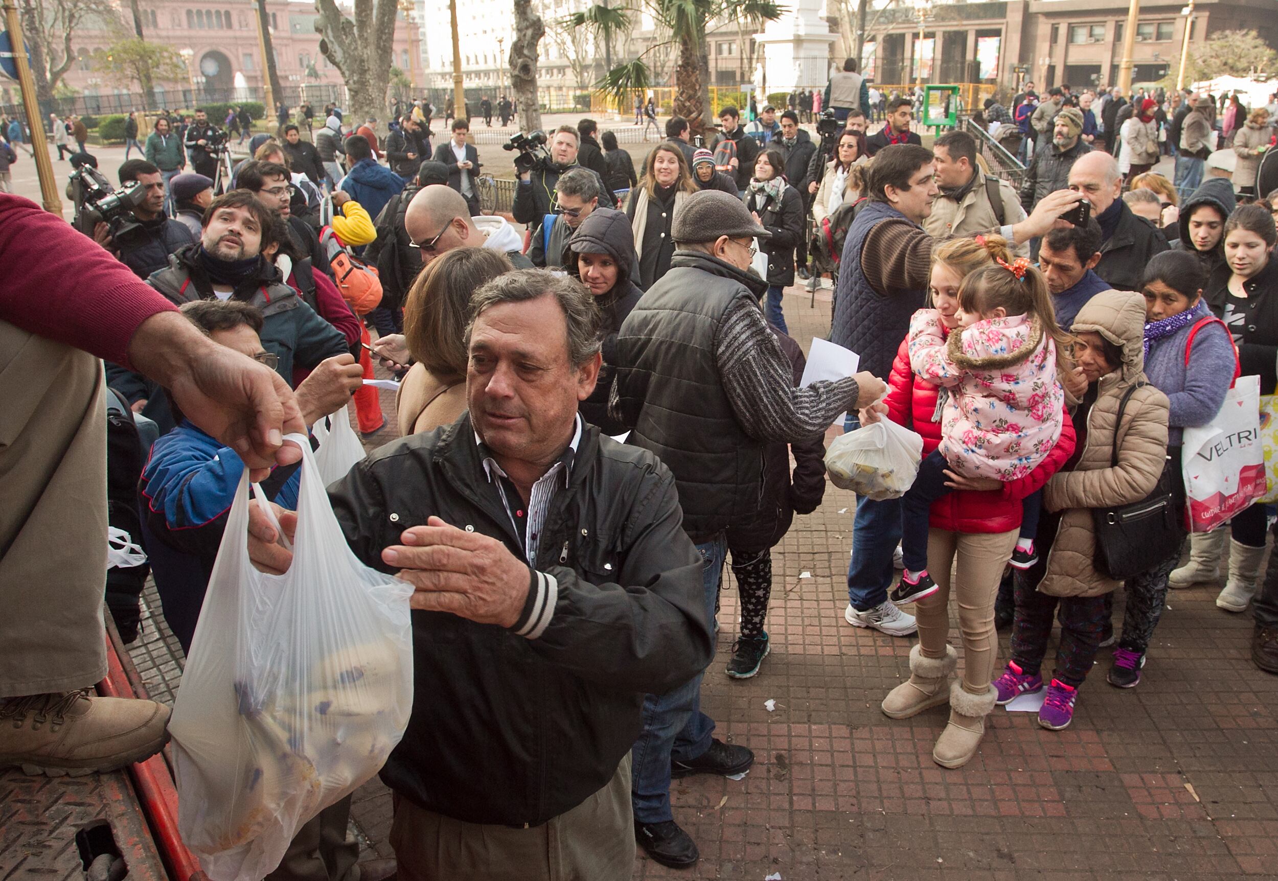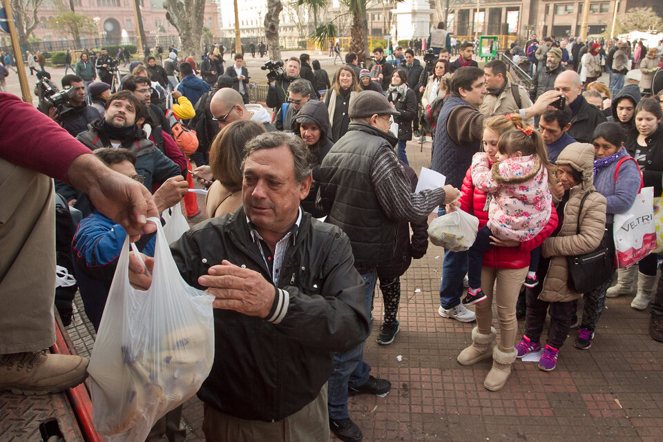 A las 9 de la mañana, decenas de personas ya hacían fila frente al camión de bananas y esperaron el comienzo de la protesta para poder llevarse los tres kilos por persona que decidieron entregar gratis los productores. “Esta es la única forma que yo puedo comer banana”, dijo una señora que se acercó hasta la plaza para conseguir la fruta. “La fruta esta carísima, es un lujo comer fruta hoy en día. Está muy caro todo”, opinó otra señora que esperaba en la fila para conseguir la fruta.