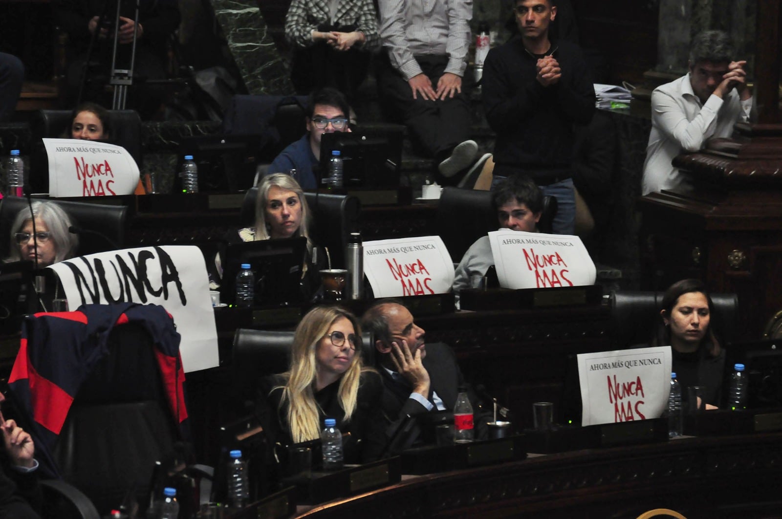 "Ahora más que nunca, nunca más", fue la consigna que los y las legisladoras de la oposición porteña eligieron este jueves para colgar ante sus bancas en rechazo al