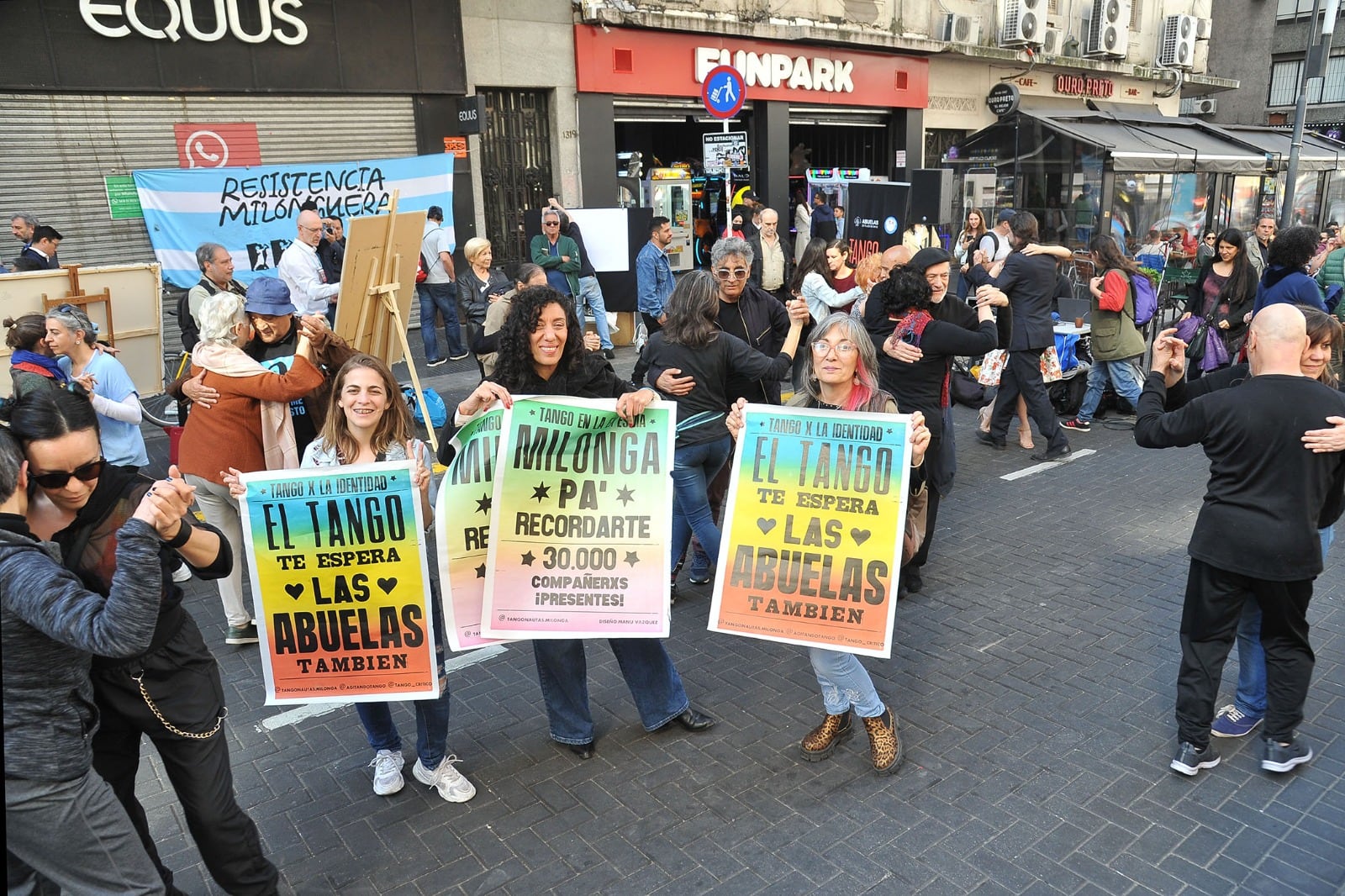 La milonga convocada por los artistas tangueros en la esquina de Corrientes y Talcahuano sirvió para sostener y amplificar el mensaje y la lucha de Abuelas de Plaza de Mayo.