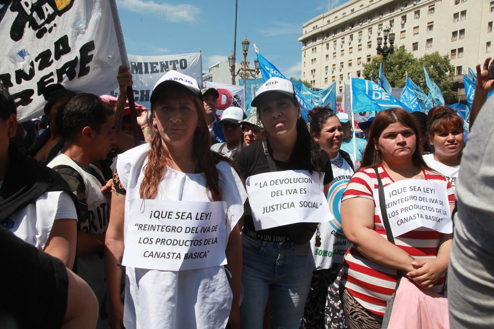 La Unión de Trabajadores de la Economía Popular manifestó frente al Congreso para apoyar que se convierta en ley la devolución del IVA en la compra de productos de la canasta b