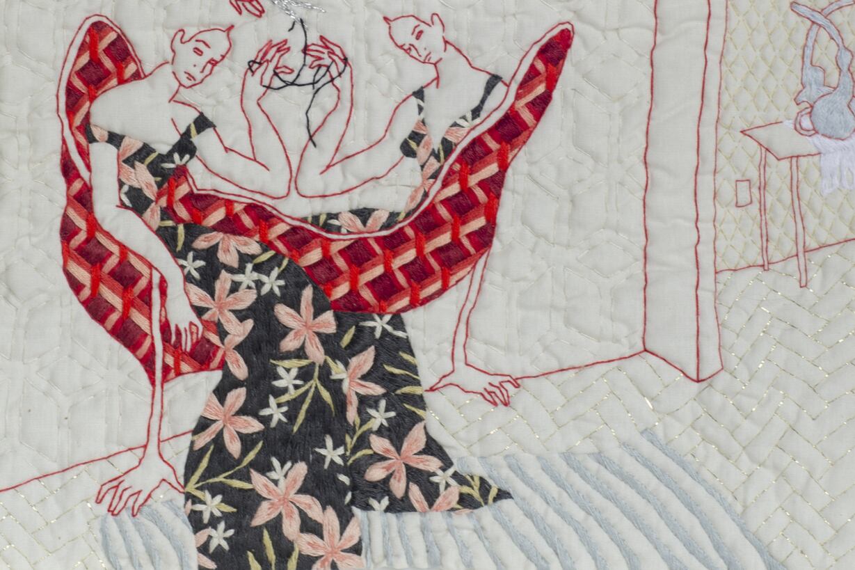 Nicole Mazza tomó como punto de partida el relato de Leda y el cisne y, a través de su bordado, creó una nueva narrativa poética plasmada en 32 obras que pueden verse en el Centro Cultural Borges. En este trabajo, hay ciertos elementos que se repiten como leitmotiv: las tijeras y los cisnes, que hablan del trabajo manual de las mujeres y de la potencia de ciertos mitos donde se naturaliza el amor y el sacrificio.