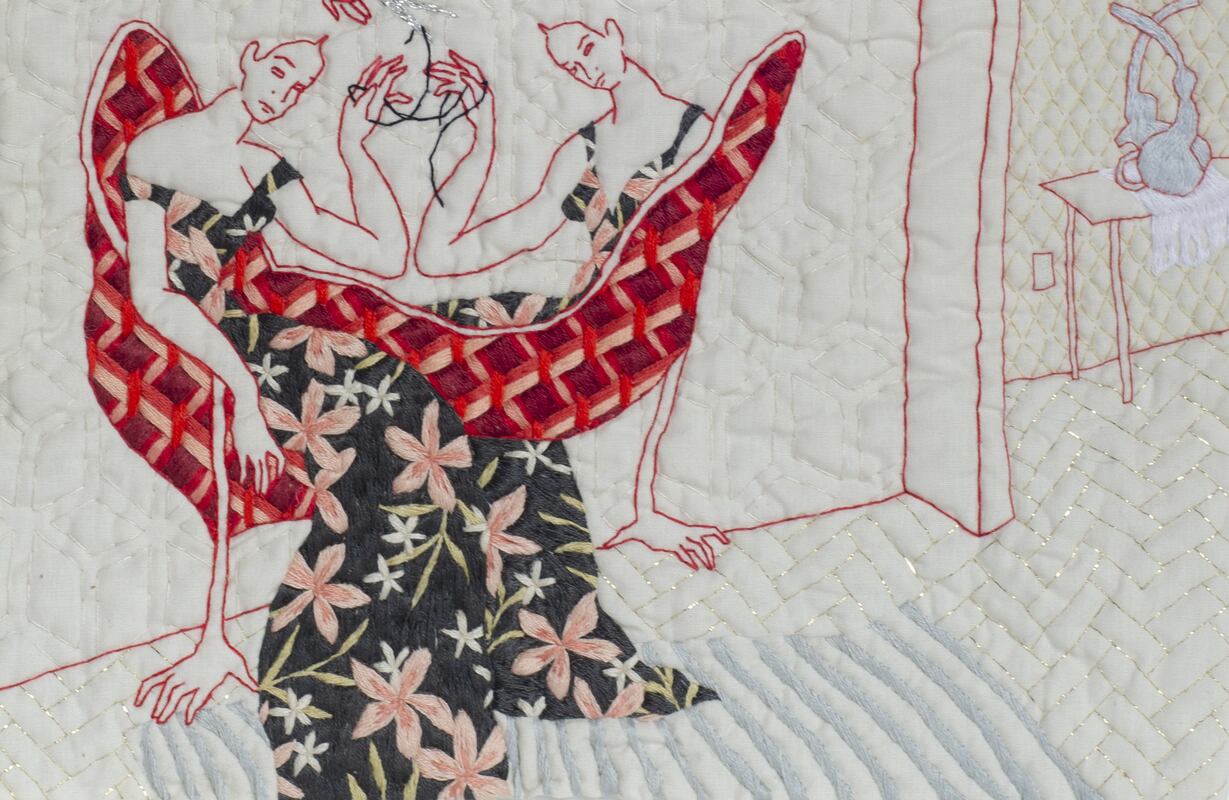 Nicole Mazza tomó como punto de partida el relato de Leda y el cisne y, a través de su bordado, creó una nueva narrativa poética plasmada en 32 obras que pueden verse en el Centro Cultural Borges. En este trabajo, hay ciertos elementos que se repiten como leitmotiv: las tijeras y los cisnes, que hablan del trabajo manual de las mujeres y de la potencia de ciertos mitos donde se naturaliza el amor y el sacrificio.