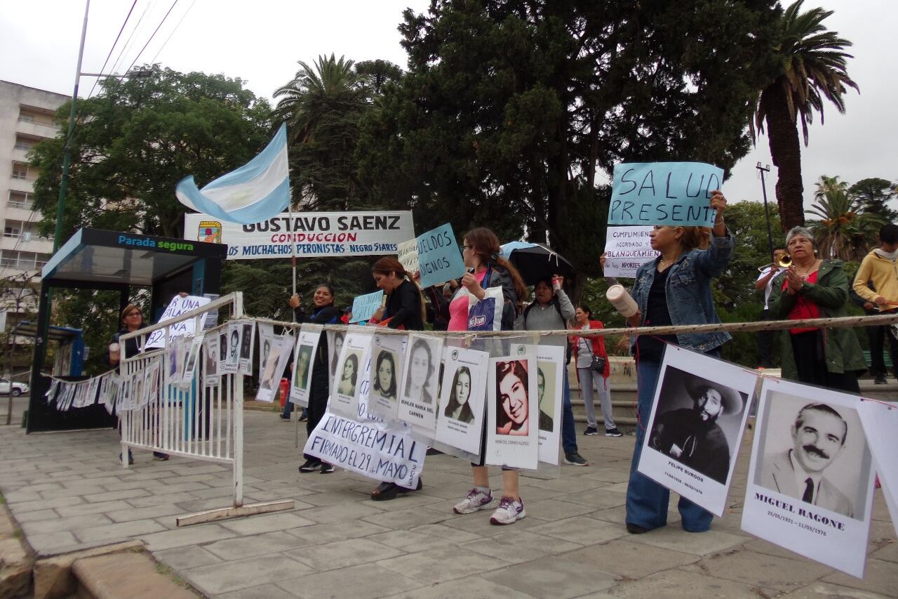 Junto a trabajadores de distintas áreas se manifestaron frente a la Legislatura provincial, durante el acto de jura del gobernador Gustavo Sáenz. Reclamaron otra vez la sanción de una ley de memoria.