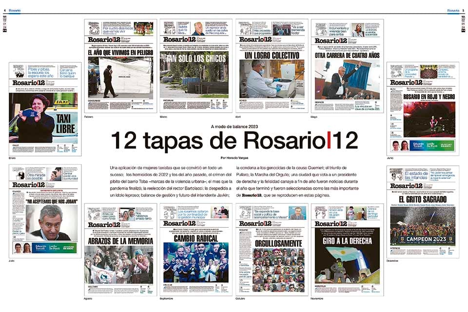 Una aplicación de mujeres taxistas que se convirtió en todo un suceso; los homicidios del 2022 y los del año pasado, el crimen del pibito del barrio Toba -marcas de la violencia urbana-; el mes que la pandemia finalizó; la reelección del rector Bartolacci; la despedida a un ídolo leproso; balance de gestión y futuro del intendente Javkin; la condena a los genocidas de la causa Guerrieri; el triunfo de Pullaro; la Marcha del Orgullo; una ciudad que vota a un presidente de derecha y la felicidad canaya a fin de año, fueron noticias durante el año que terminó y fueron seleccionadas como las más importante de Rosario/12, que se reproducen en estas páginas.