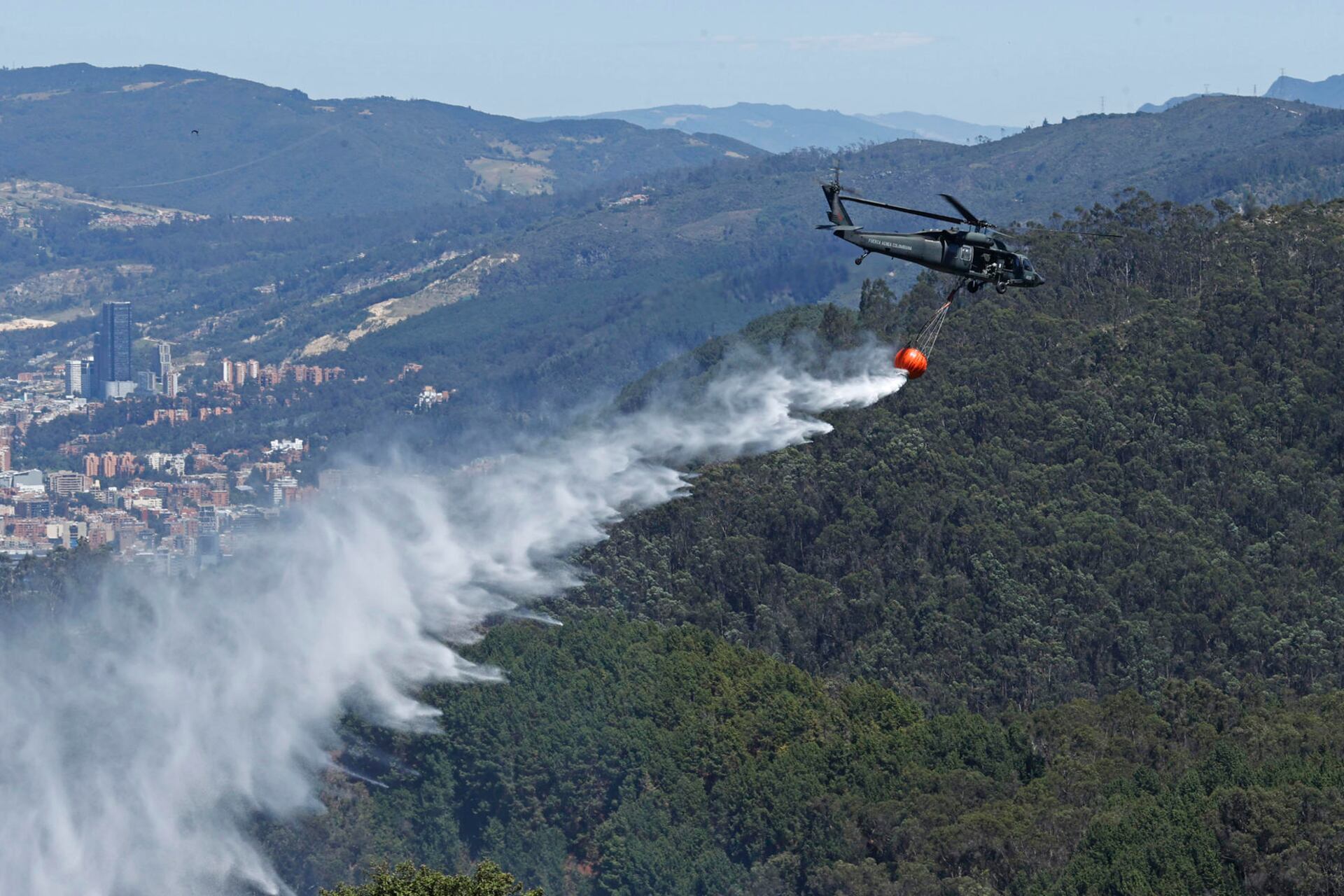 El incendió en los cerros orientales de Bogotá, que aún sigue activo, ya consumió 12 hectáreas de bosques en los últimos dos días y las labores de extinción del fuego han dejado cuatr