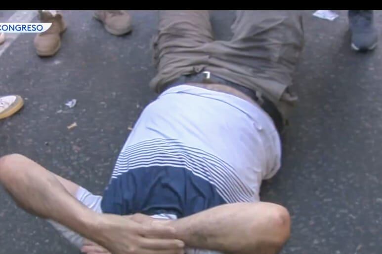 El dirigente del Polo Obrero, Eduardo Belliboni, quedó tendido en el suelo de la calle Callao en la tarde del miércoles luego de que la Policía Federal y la Gendarmería reprimieran y lanzaran gases