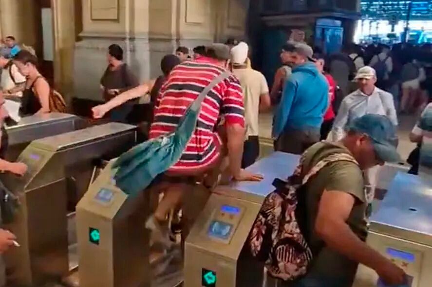 Cada vez más, cientos de pasajeros en Retiro y Constitución deciden saltar la barrera metálica para subir a las formaciones que lo regresarán a sus hogares. Patricia Bullrich insiste con más efectivos en las estaciones.