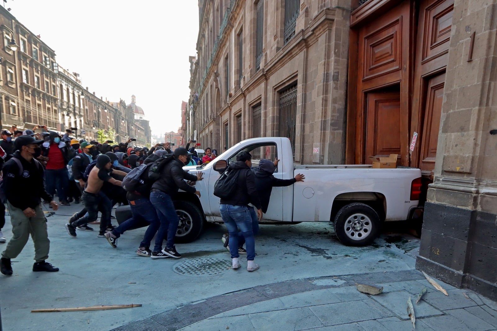 Un grupo de encapuchados, que exigía justicia por la desaparición de 43 estudiantes en 2014, tomó una camioneta e ingresó hasta el mostrador del establecimiento.