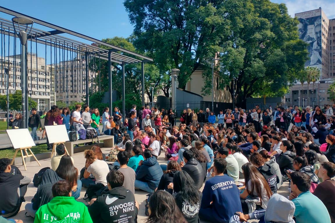 Cientos de estudiantes acomodan sus sillas sobre la calle Puán.