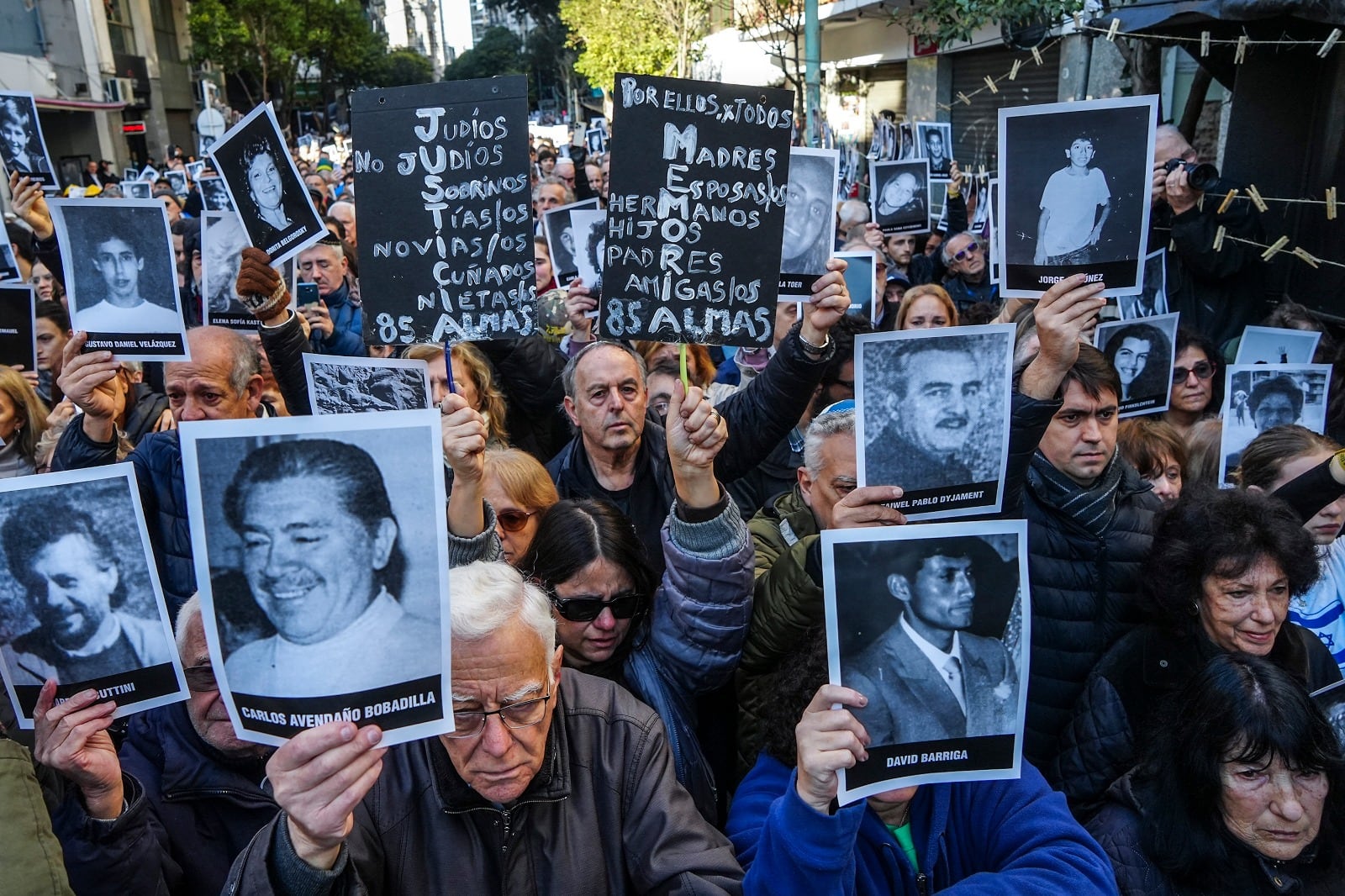 Afuera del edificio de Pasteur se renovaron las críticas a la justicia. "Son 30 años en los que el Estado argentino ha mirado para otro lado, colmado de falencias y moras”, dijo Amos Linetzky, titular de la mutual. Hubo agradecimientos al Gobierno por incorporar a Hamas como organización terrorista y se demandaron de leyes especiales.