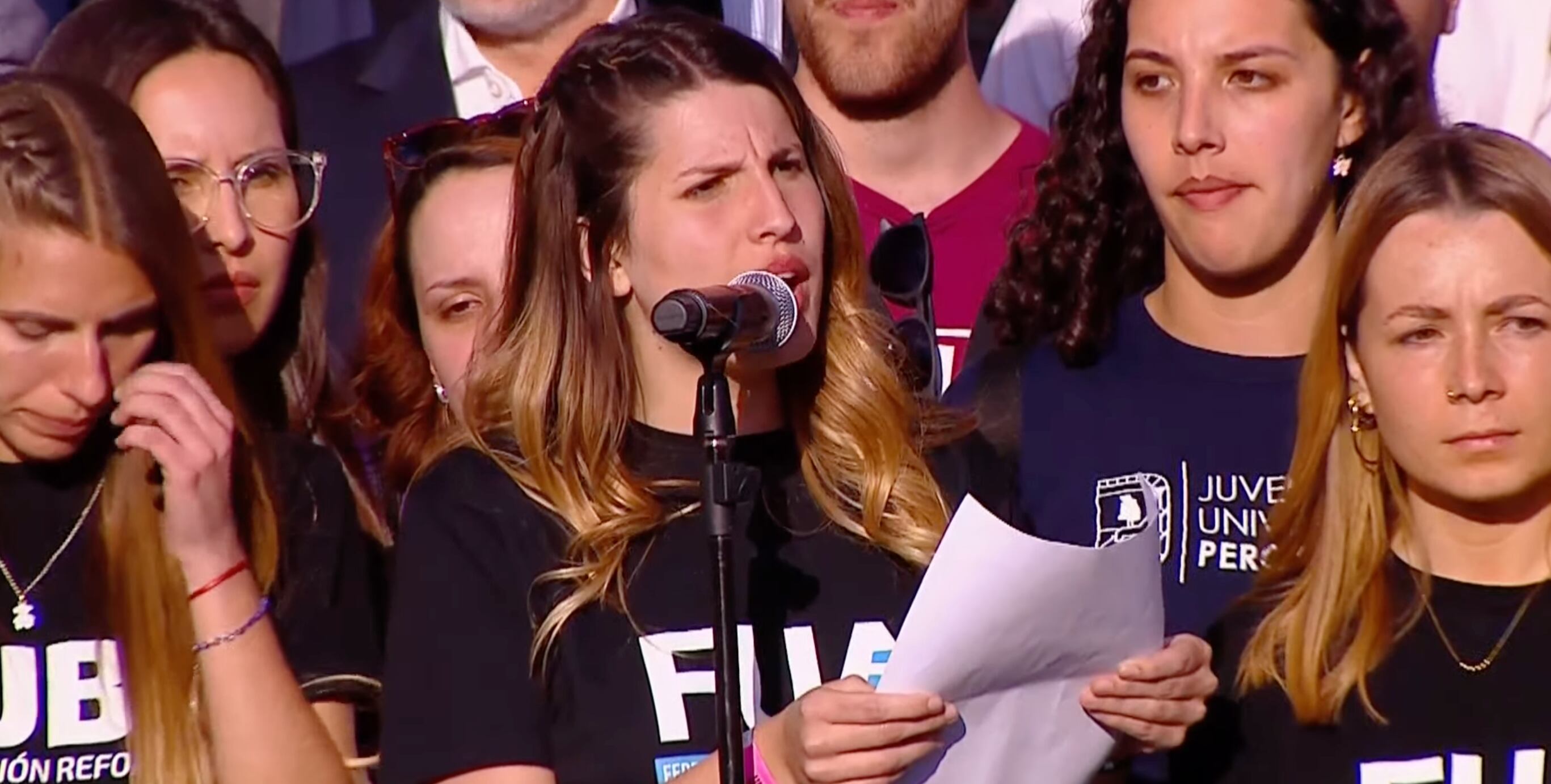 “La universidad pública, base de la democracia y el desarrollo social, lucha por su supervivencia” es el título del documento de tres páginas que se leyó en el cierre del acto central de la Marcha Federal Universitaria, en la Plaza del Congreso. La lectura estuvo a cargo de Piera Fernández de Piccoli, presidenta de la Federación Universitaria Argentina (FUA).