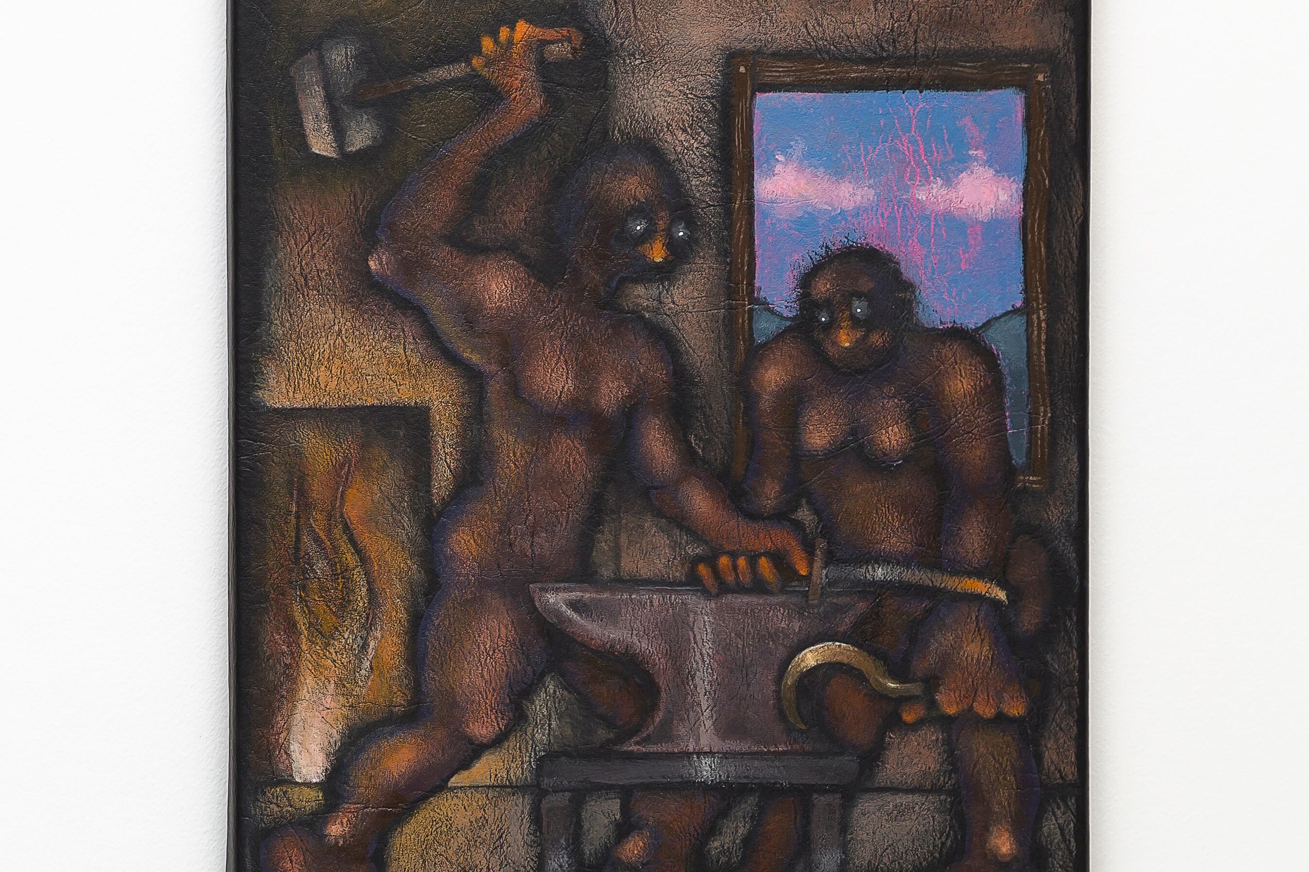 Aizicovich retrata episodios de la historia universal como si hubieran sucedido a la vez, en un tiempo primitivo. En la exhibición conviven celulares y herrerías junto a una Eva escuchando el llamado de la tentación. Las obras parecen tener como referencia a Carpani y a Guayasamín, lejos del arte contemporáneo.