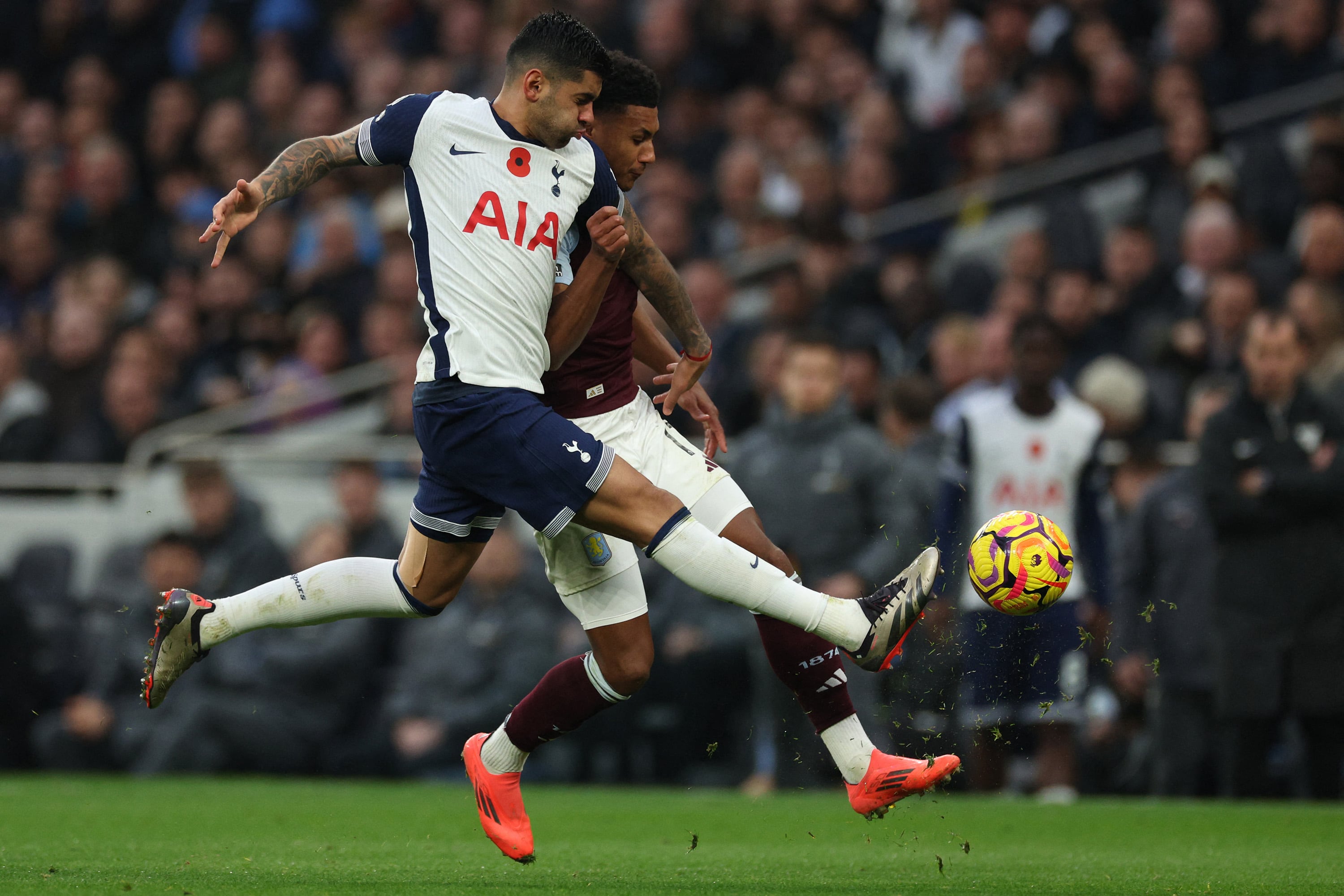 El defensor se fue lesionado del 4-1 del Tottenham contra el Aston Villa del Dibu Martínez. Goles de Lautaro y Retegui en Italia. Triunfo del Atlético de De Paul y Julián en España.