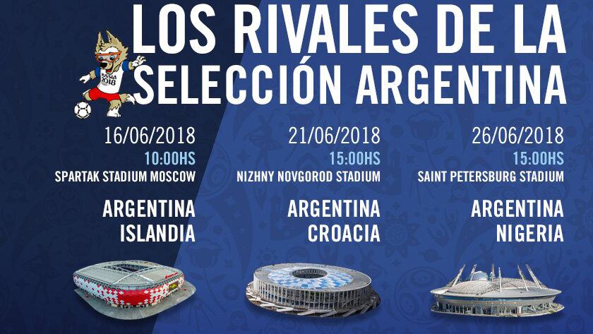 En el sorteo realizado hoy en Moscú la Selección quedó como cabeza de serie del Grupo D. Debutará el 16 de junio en la capital rusa ante Islanda, debutante en un Mundial. Cinco días más tarde enfrentará a Croacia y el 26 cerrará la fase de grupos contra Nigeria