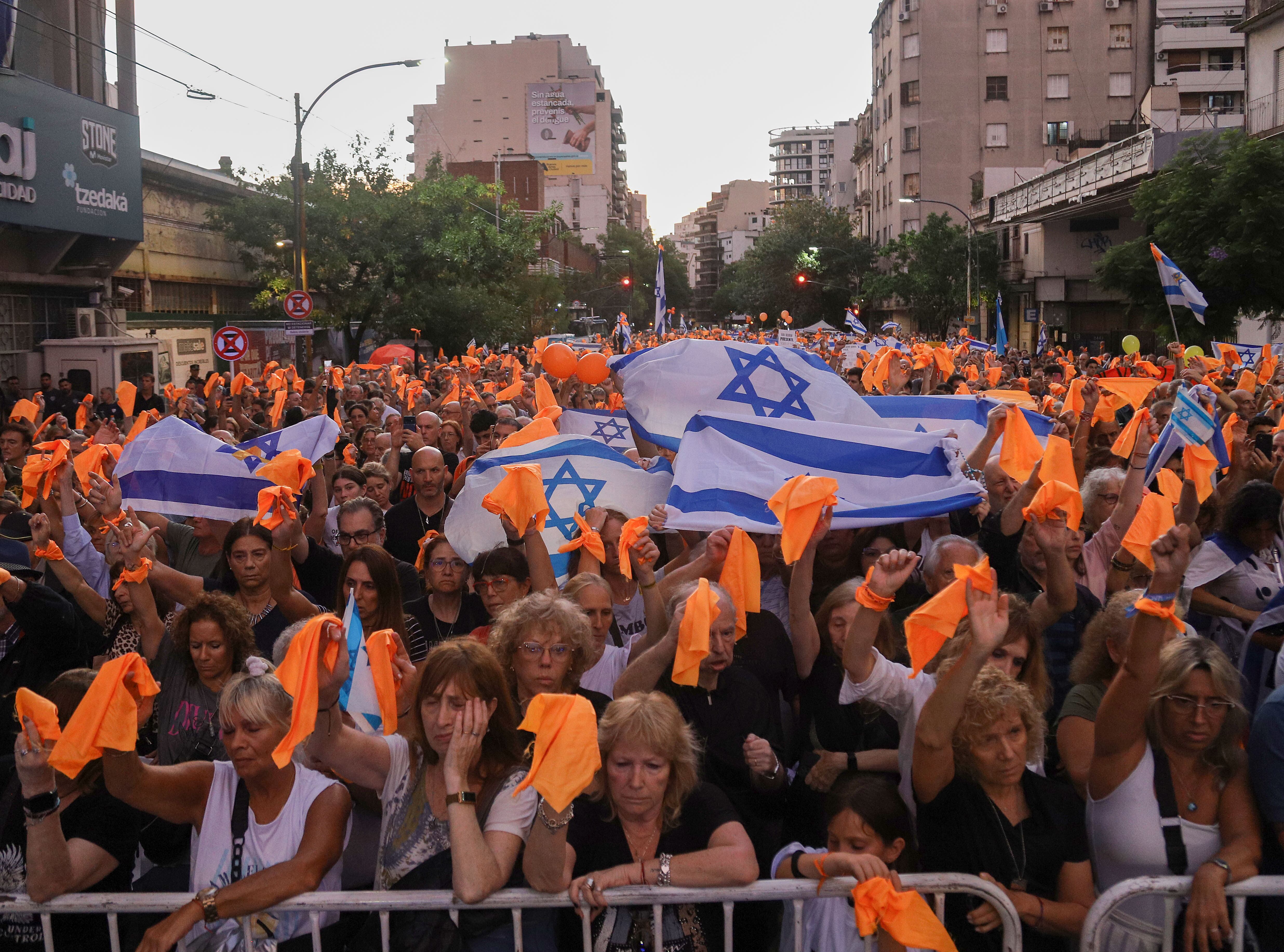 En los aledaños de la avenida Estado de Israel y la calle Palestina se concentraron este lunes miles de personas reclamando la devolución de los 73 rehenes que siguen secuestrados por la organizaci