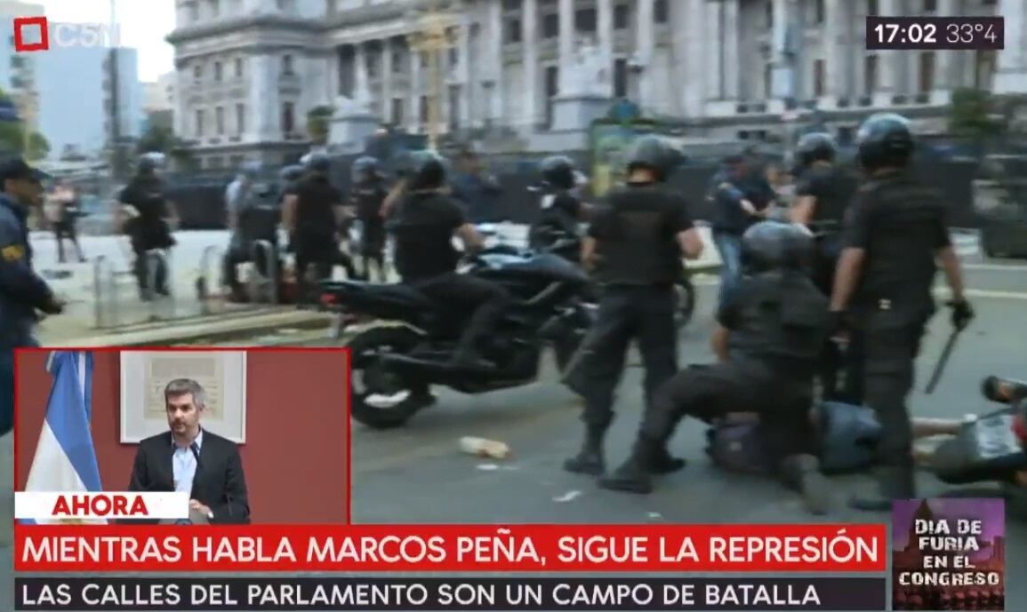 Mientras el jefe de Gabinete, Marcos Peña, denunciaba en conferencia de prensa a "los miles que tiraron palos" y acusaba de "piqueteros" y "violentos" a los diputados de la oposición, el inmenso op