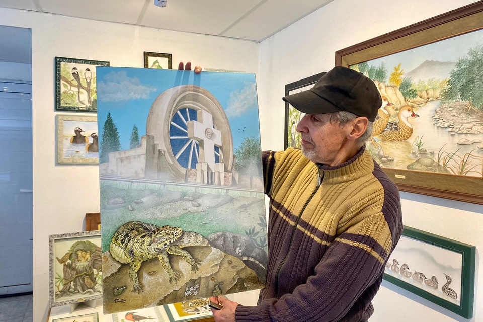 Últimamente está buscando cruzar los animales con el paisaje cotidiano del pueblo. “Pinté el puente con golondrinas tijeritas haciendo sus nidos. Hice el cementerio y ubiqué cerca los lagartos overos que tuvieron cría, se ven los pichones tomando sol. También, acá, unas gallaretas nadando en el río, justo en el puente roto”, explica y señala entre sus pinturas. A Enzo le interesa esa mezcla: la naturaleza y el día a día, volver a pasar por el pincel los lugares que se transitan y se viven sin tanta atención. “Siempre estoy trabajando en varias cosas a la vez. Salto de una obra a otra, depende de la idea que se me cruce. Eso es pintar para mí, una pasión”, concluye.