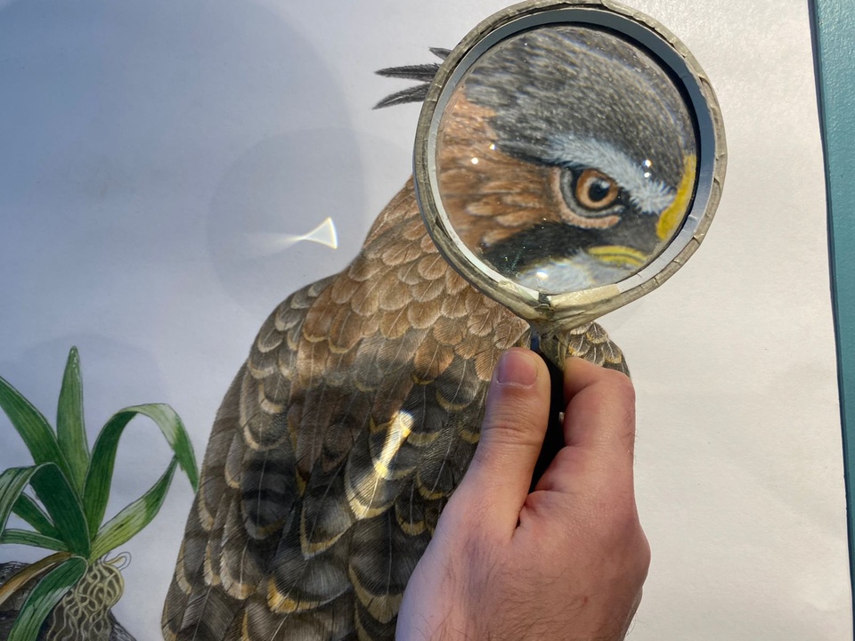 “El taller de Frattini está a unas cuadras de acá, si quieren pueden ir y llamar que seguro los atiende”, explica la mujer de la oficina de turismo, y el grupo arremete en busca del taller del ilustrador, que sale a recibir al público cuando un transeúnte aplaude en la puerta de su estudio; un espacio lleno de luz solar en donde el artista exhibe y guarda obras en todos los recovecos posibles. Invita a pasar, muestra el espacio, los cuadros en donde se ven pajaritos, zorros, pumas, lechucitas vizcacheras, guanacos y algo que, para el ojo no entrenado, parece una yarará. “Es una culebra pampeana. Habita únicamente en el cerro ventana”, aclara Frattini y saca una lupa para detenerse en el detalle de las pieles y los pelajes: “lo particular de lo que hago yo es que trabajo el pelo, la pluma o la escama de forma individual. Dibujo cada pelito, cada hebra, cada fibra, y eso da una sensación de realismo muy grande”, dice.