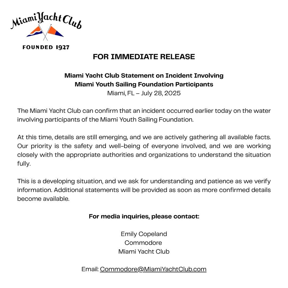 El Miami Yacht Club, donde funciona la Miami Youth Sailing Foundation, confirmó que el accidente involucró a participantes de su programa, y aseguró que están colaborando con las autoridades para esclarecer lo ocurrido.