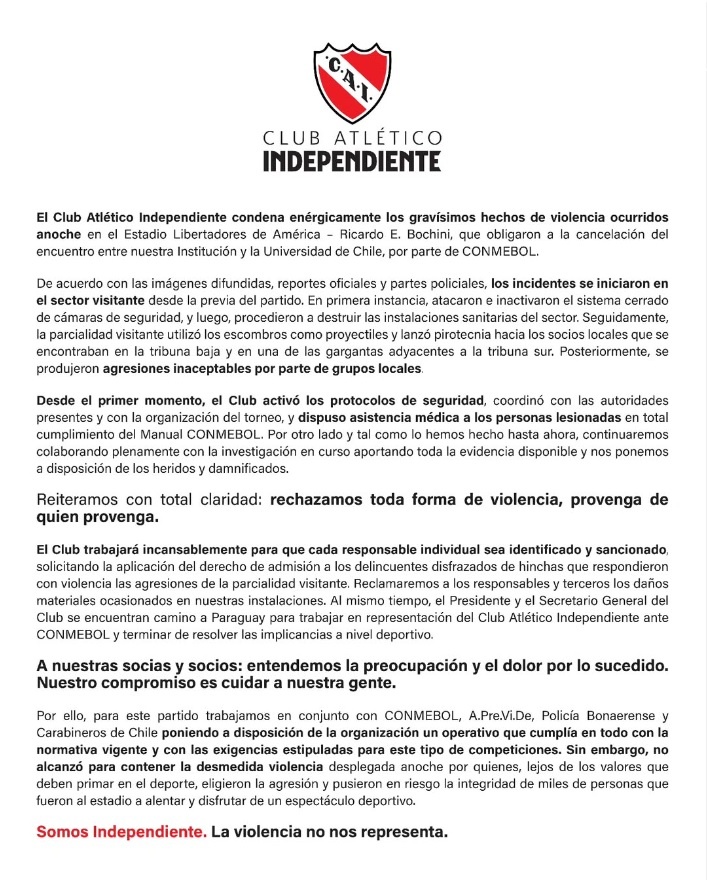 El presidente de Independiente, Néstor Grindetti, repudió los incidentes y aseguró que viajará a Paraguay para defender los intereses de la institución. "Corresponde una sanción al club chileno y una liberación de responsabilidad a Independiente", remarcó el dirigente