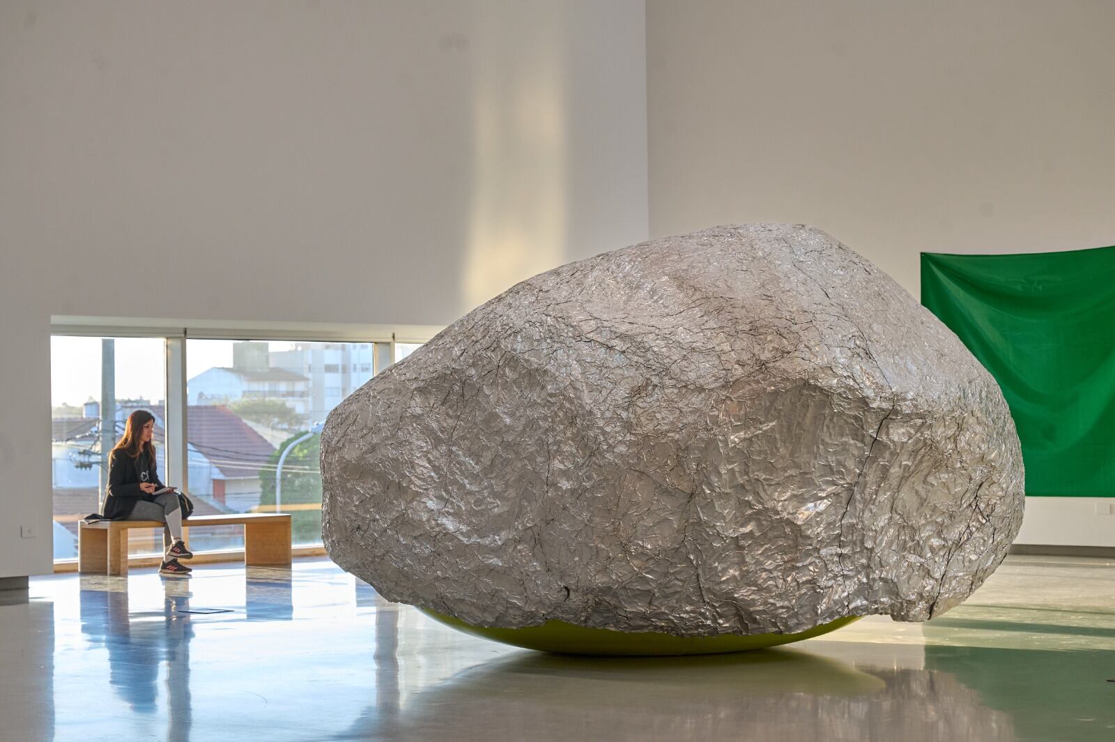 La piedra de aluminio toma el centro de la escena. Sobre las paredes, los colores tienen movimiento, vida propia. Cinco telas escalan hacia el cielo, otra espera, tensada sobre el piso.