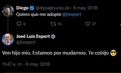 Esto sigue en otros tuits de Spagnuolo como en el que le dice: "Quiero que me adopte José Luis Espert". Y el ahora candidato que dice que no tenía trato le contesta: "Ven, hijo mío. Estamos por mudarnos. Te cobijo". Esto fue en mayo de 2018, lo que habla de una relación duradera y de vieja data.