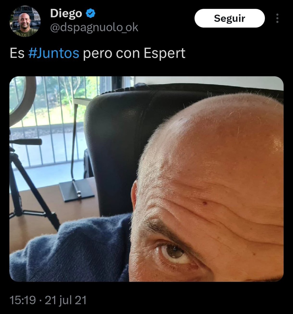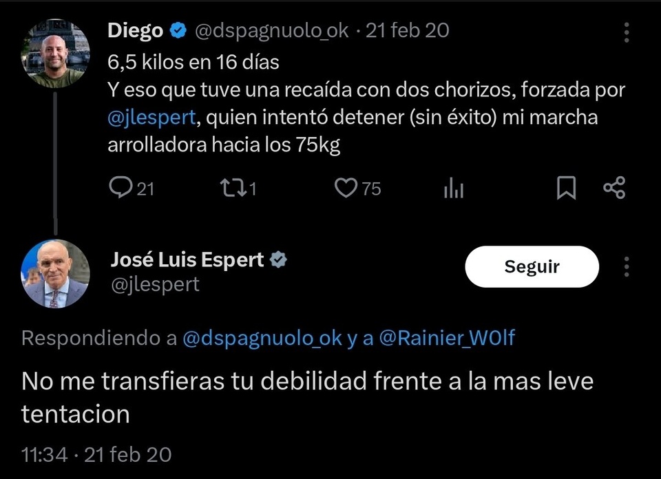 "6,5 kilos en 16 días. Y eso que tuve una recaída con dos chorizos, forzada por José Luis Espert, quien intentó deterner (sin éxito) mi marcha arrolladora hacia los 75 kg", escribió Spagnuolo en febrero de 2020. Espert, le contestó, en tono socarrón: "No me transfieras tu debilidad frente a la más leve tentación". Notese el trato de confidente y de amistad entre ambos.