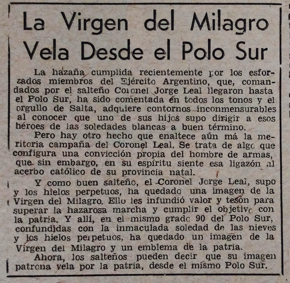 Jorge Edgar Leal, que había nacido en 1921 en Rosario de la Frontera, sur de la provincia de Salta, estaba al frente de la misión. Ese día izó la bandera Argentina en uno de los rincones más remotos del globo y luego dejó en la meseta antártica una réplica de la imagen de la Virgen del Milagro. "Ahora los salteños pueden decir que su imagen patrona vela por la patria, desde el mismo Polo Sur", cerró la breve crónica periodística de aquel viernes.