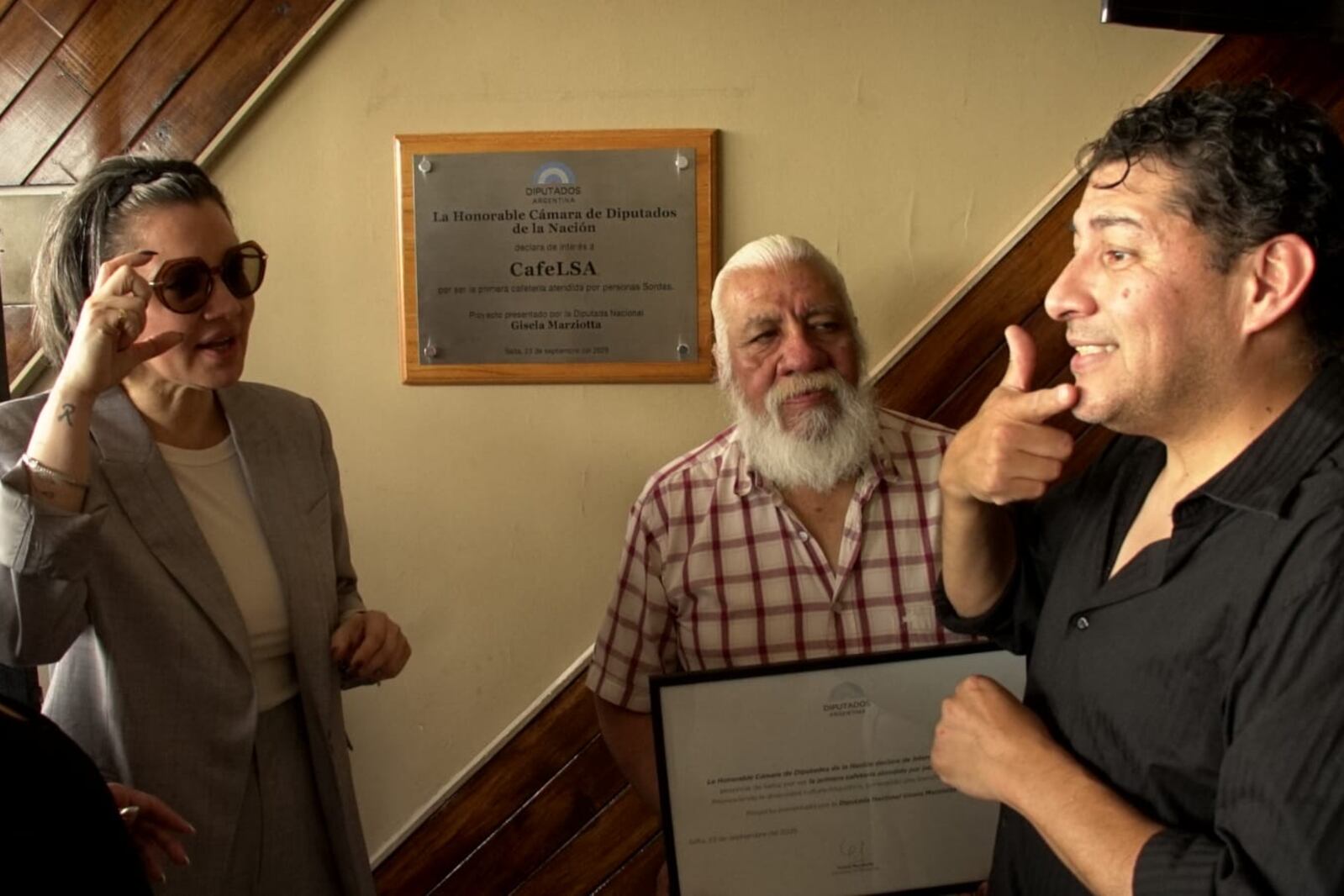 La Cámara de Diputados de la Nación declaró de interés nacional al CaféLSA, la primera cafetería del país atendida íntegramente en Lengua de Señas Argentina. El reconocimiento fue entregado en Salta por la legisladora nacional, en un acto en el que participaron trabajadores sordos, familiares, referentes políticos y organizaciones sociales.