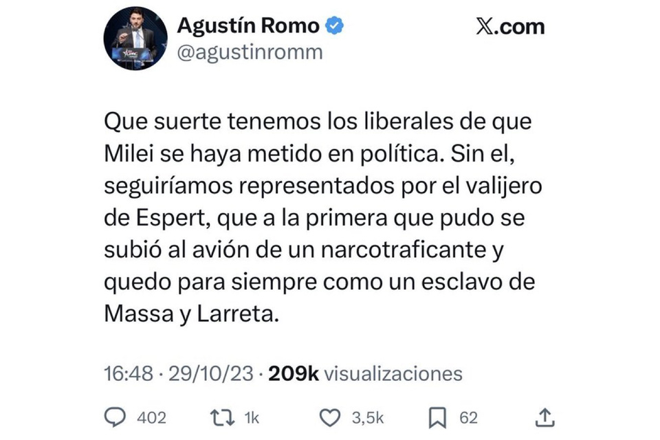 Agustín Romo, hoy jefe del bloque libertario bonaerense, ironizaba en la misma época a través de sus redes sociales: “Qué suerte que Milei se metió en política. Sin él, seguiríamos representados por el valijero de Espert, que a la primera se subió al avión de un narcotraficante”.