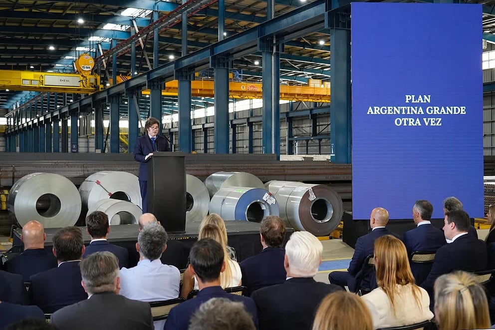 Javier Milei volvió a hacer campaña en territorio bonaerense en un acto a puertas cerradas en la planta que Siderca construye en la ciudad de San Nicolás.